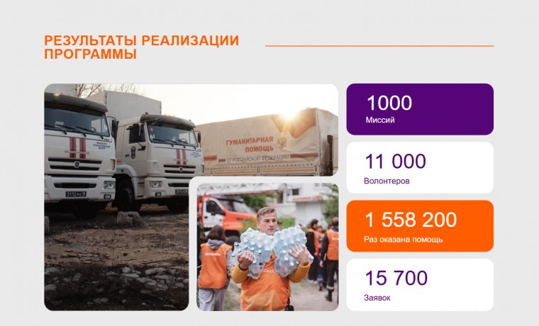 В рамках программы волонтеры получали комплексную поддержку: единовременные выплаты в случае увечья (до 3 млн руб.), инвалидности (4 млн руб.) или гибели (5 млн руб.), обучение онлайн по гуманитарной помощи, первой медицинской и психологической поддержке, а также информирование о безопасных местах пребывания в регионах деятельности. Все часы участия в миссиях фиксировались в платформе Добро.рф.