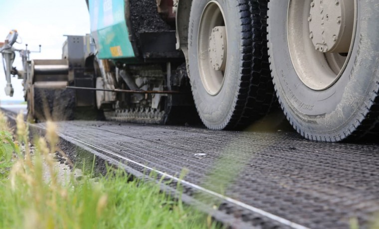 Здесь ведутся работы по укладке асфальтобетонного покрытия с устройством геосетки. По словам представителя подрядной организации, применение геосетки в ремонте дорог способствует усилению дорожной одежды и повышению срока эксплуатации дороги с асфальтобетонным покрытием, так как данный материал обладает высокой прочностью и износостойкостью.