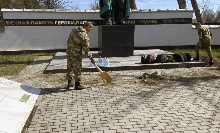 Росгвардейцы благоустроили расположенный в Грозном мемориал героям, павшим в боях за свободу и независимость Родины: очистили прилегающую территорию от мусора и сухой листвы, подмели пешеходные дорожки, привели в порядок клумбы и восстановили покрытие у основания памятных стел.