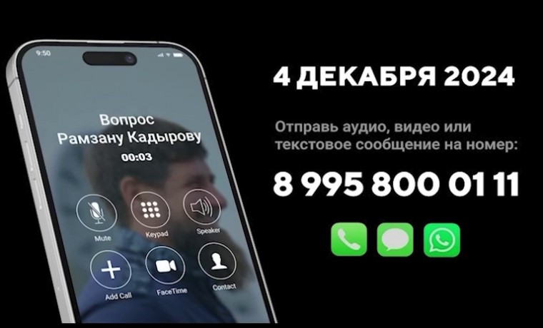 4 декабря 2024 года состоится прямая линия с Главой Чеченской Республики Рамзаном Кадыровым. Свой вопрос можно отправить через различные мессенджеры на номер 8 (995) 800-01-11.